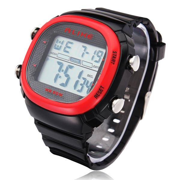 Diese sportliche Uhr hat ALIKE eine schlanke Digitalanzeige und ein modernes Design. Die Uhr zeigt sowohl die Zeit und das Datum, und ist auch mit Licht, ein Alarm und ein Chronographen ausgestattet. Die Uhr ist in silber, blau, orange und rot erhältlich. Das Band besteht aus Gummi gefertigt und verfügt über eine bequeme Schnalle.