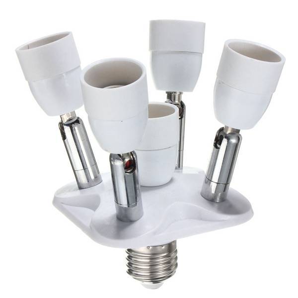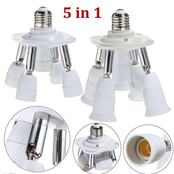 Dieser Artikel ist ein 5 in 1 flexible Lampen-Splitter. Der Splitter ist in zwei Modellen (E27 bis E14 bzw. E27 bis E27) zur Verfügung. Durch diese Lichter Splitter Sie fünf Glühbirnen in einem Adapter laufen können. Jeder Schenkel des Teilers hat eine maximale Leistung von 250 W (dh insgesamt 1250W). Der Fall der fünf in einem flexiblen Lampe Teiler besteht aus PBT und hat eine weiße Farbe.