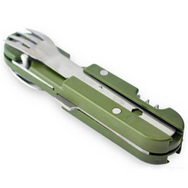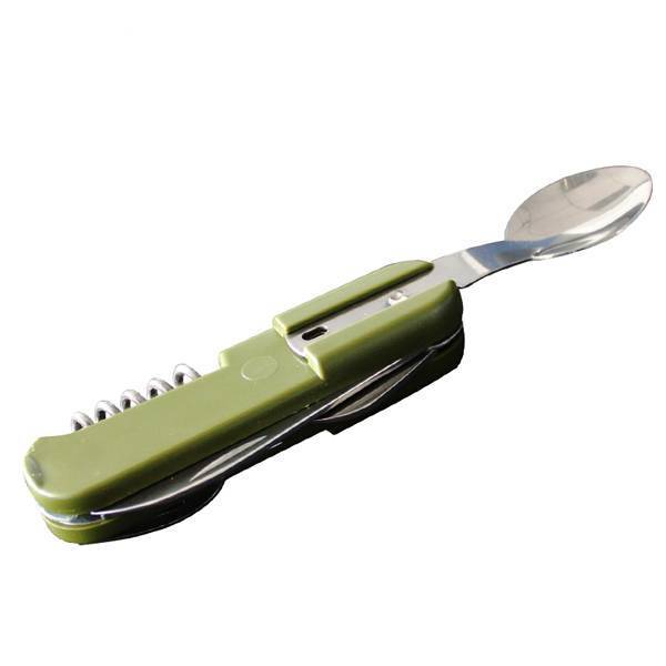 Wenn ein Taschenmesser, aber mit Campingbesteck Dies ist ein kompletter Satz zusammen. Mit Edelstahl-Gabel, Löffel und Messer, und darüber hinaus einen Korkenzieher und Flaschenöffner. Stellen Sie sicher, Sie haben es immer mit Ihnen.