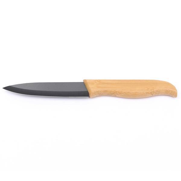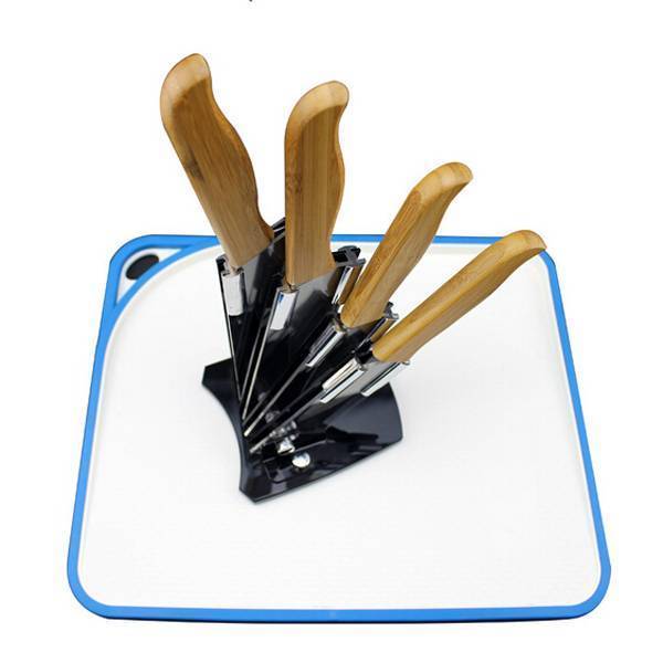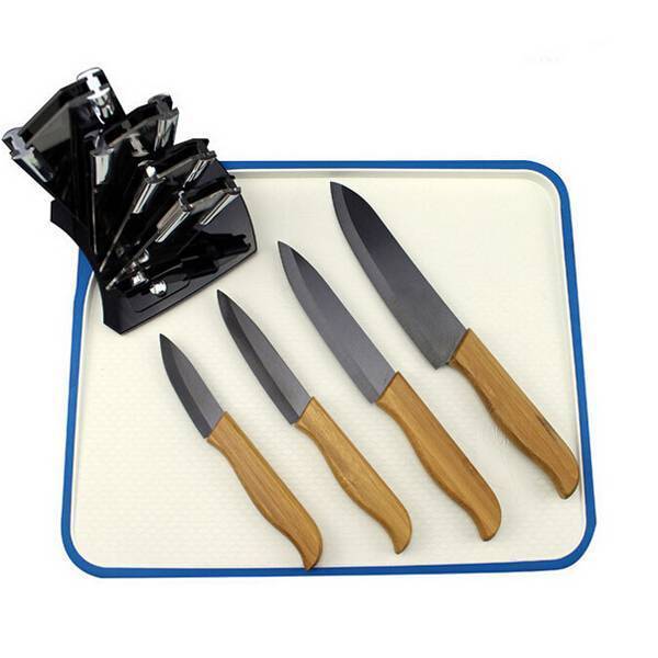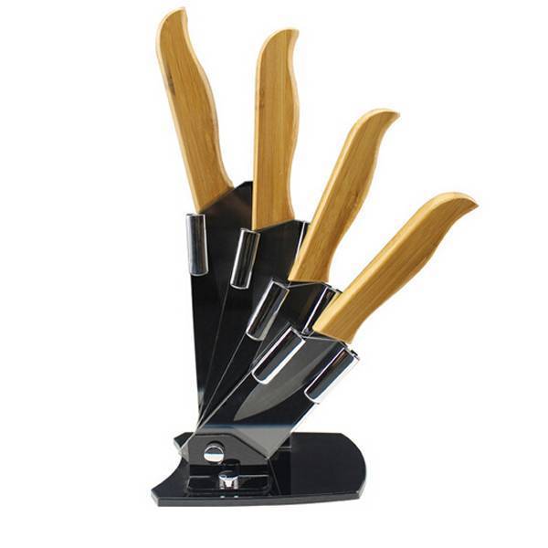 Diese erstaunliche Keramikmesser Set enthält vier Messer und einen Messerblock. Die Messer sind hart und Bildschirm und sind nicht so schnell langweilig. Die Blätter liefern keinen Geruch und haben einen schönen Griff aus Bambus.