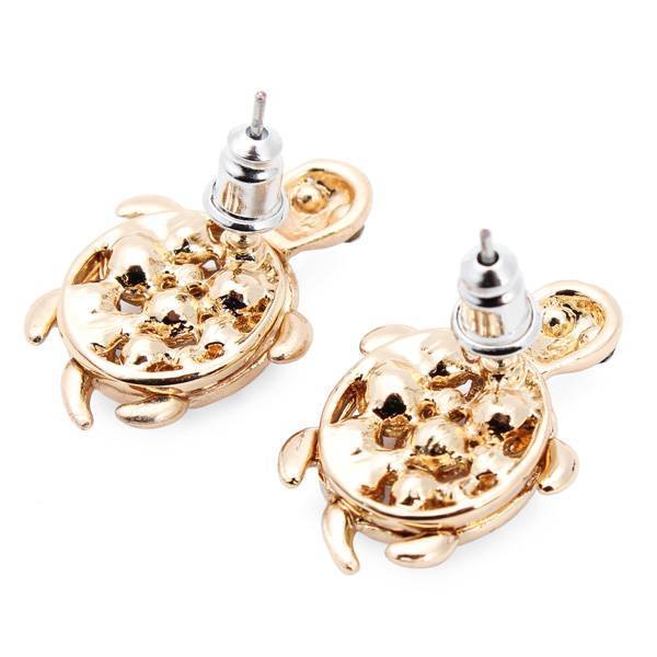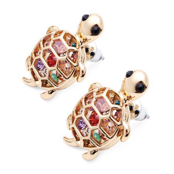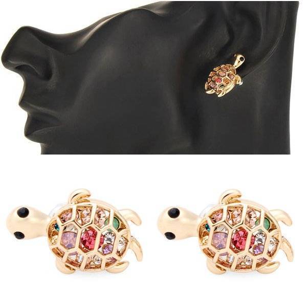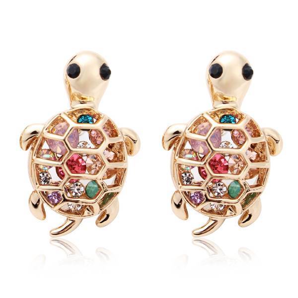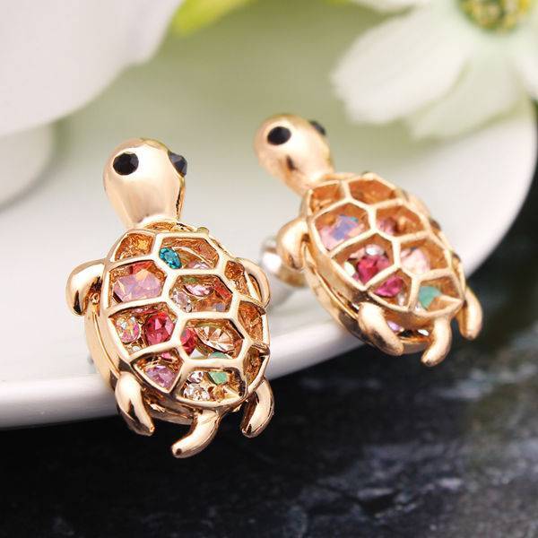 Diese niedlichen Ohrringe in Form einer Schildkröte und einem netten Accessoire, das für den Alltag geeignet ist! Die Ohrringe haben eine schöne goldene Farbe und gefüllt mit bunten Kunst-Kristallen. Das Paar von Schildkröten ist ein echter Hingucker und verleiht jedem Outfit eine bunte Note.