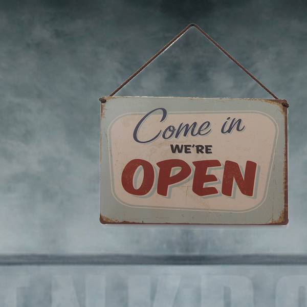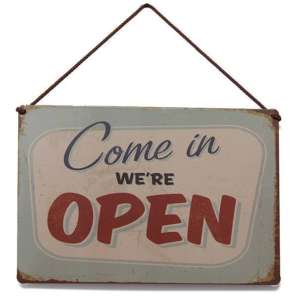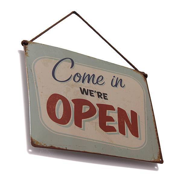 Plaque sagt: "Kommen Sie herein, wir sind offen"