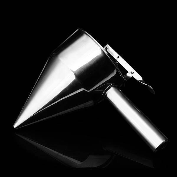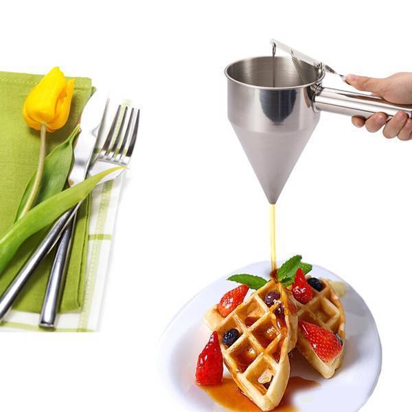 Beim Kochen und Backen, ist es manchmal notwendig Zutaten gut zu dosieren. Für Flüssigkeiten, kann mit dieser Dosierung Richter. Es funktioniert einfach. Die Öffnung des Trichters ist durch eine Kappe auf der Innenseite geschlossen. Der Knopf über dem Griff in der Presse, die Kappe und die Flüssigkeit herausfließen kann. Beim Loslassen wird der Trichter wieder die Taste geschlossen. Dies ist sehr nützlich, wenn Pfannkuchen zum Beispiel, oder die Dosierung von Saucen. Wenn Sie den Trichter nicht verwenden, können Sie es in der mitgelieferten Wiege gelegt. Mit diesem Halter sind Sie nicht flüssig läuft ab und das Loch sauber.