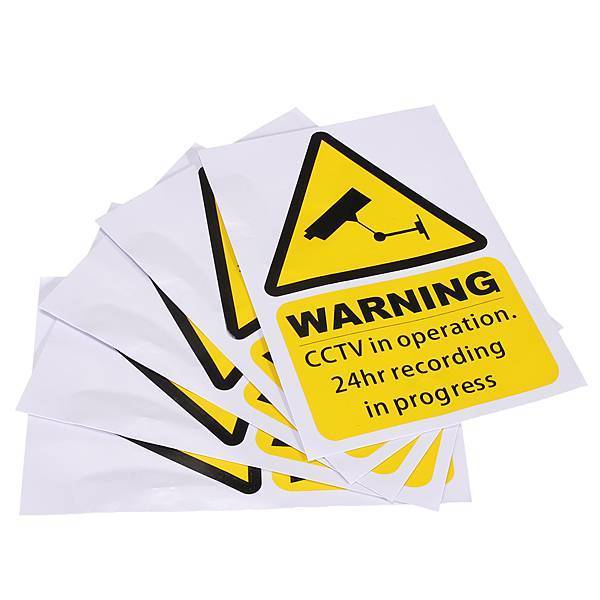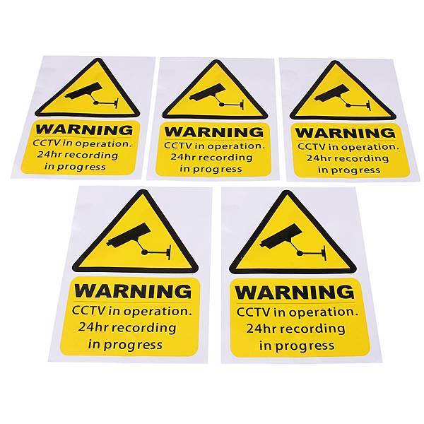 Diese Warnhinweise geben deutlich, dass Kameras und alles hängen, die in und um Ihr Auto (oder Haus) passiert ist, auf Video festgehalten. Die Warnhinweise werden von fünf geliefert. Der Text ist in englischer Sprache.