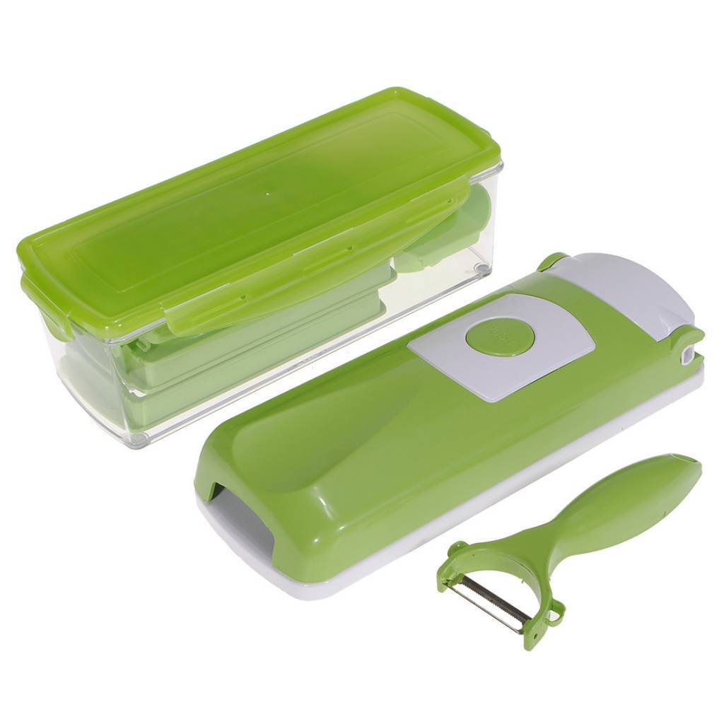 Dies ist ein sehr umfassendes Paket schnell und einfach schneiden Obst und Gemüse. Das Set spart nicht nur Zeit, sondern sorgt auch dafür, dass Sie nicht mehr unzählige Küchen Mittel benötigen (Messer, Schüsseln, Schneidebretter, etc.). Einfach und platzsparend so!