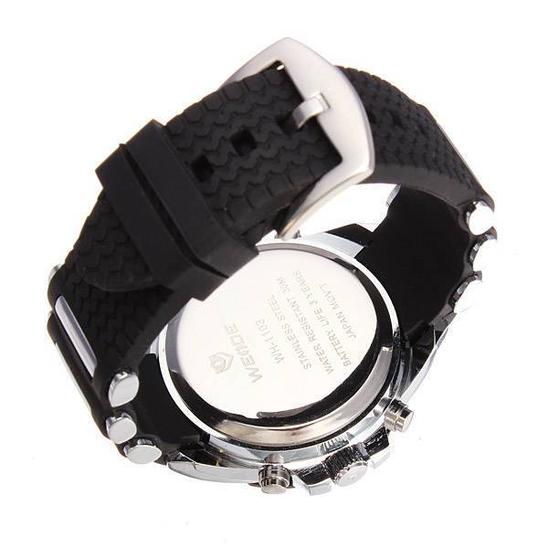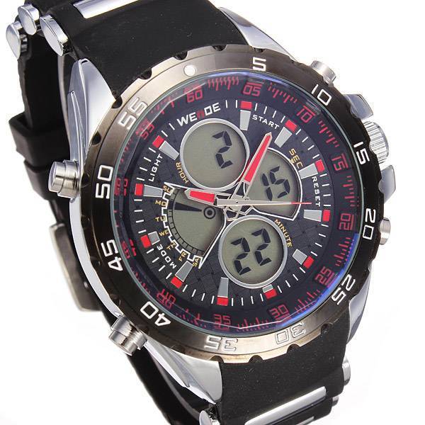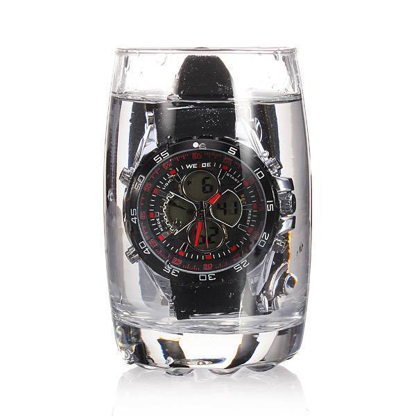 Diese digitale Sportuhr WIESE ist wasserdicht und hat eine Wahl, wo die Zeit auch digital angezeigt wird. Die Uhr zeigt auch die Tage der Woche.