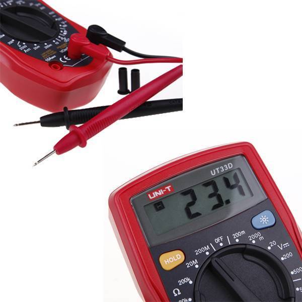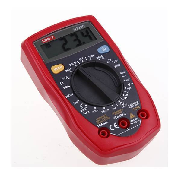 Mit Multimeters oder Universal Lehren der Spannung, Strom und Widerstand in einer Schaltung zu messen. Das Multimeter UNI-T ist ein Digital-Multimeter mit LCD. Dies sind die Werte, die von Ihnen gemessen erscheinen in respectevelijk Volt, Ampere und Ohm. Das Multimeter sollte über Kabel angeschlossen werden.